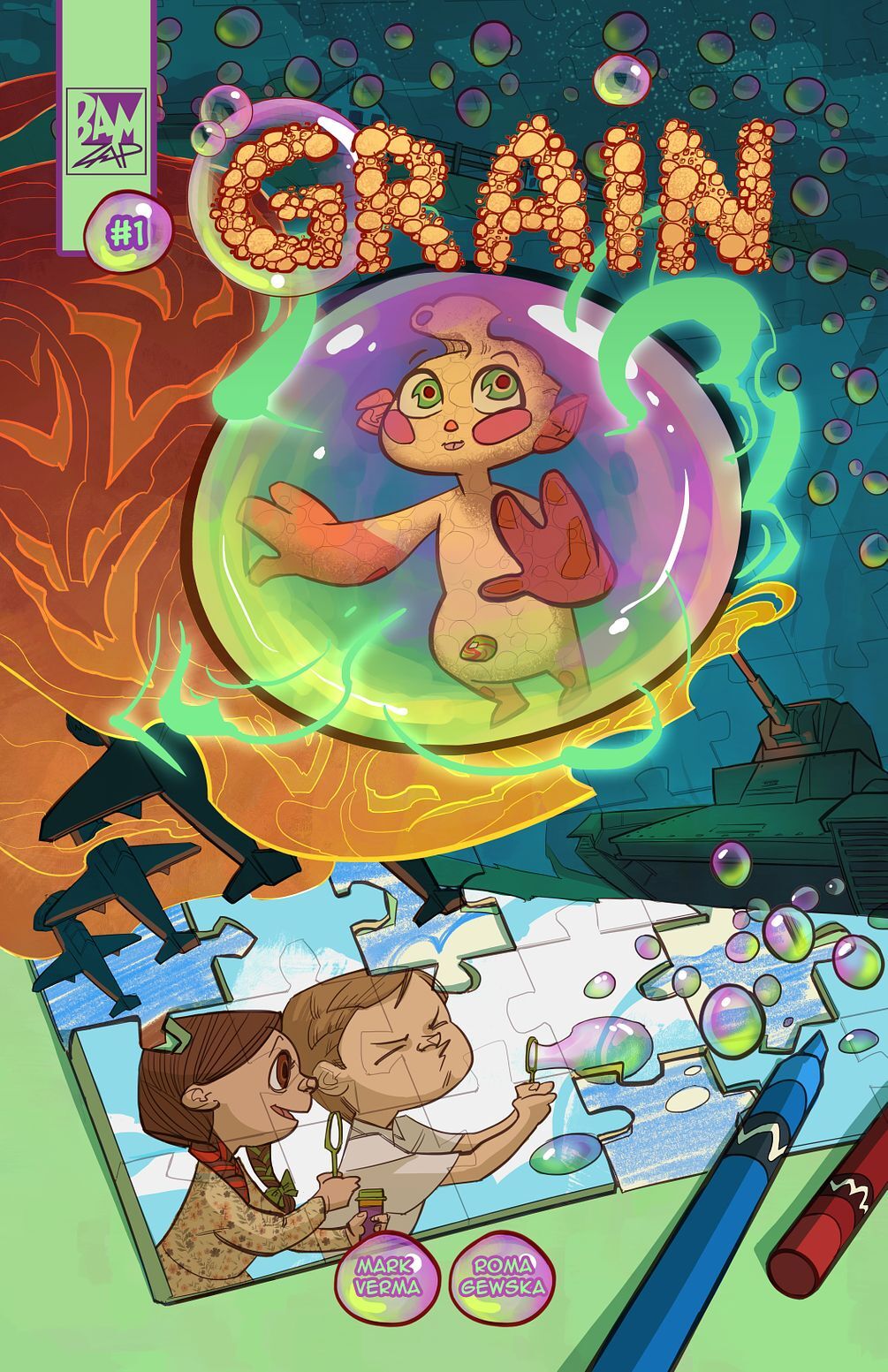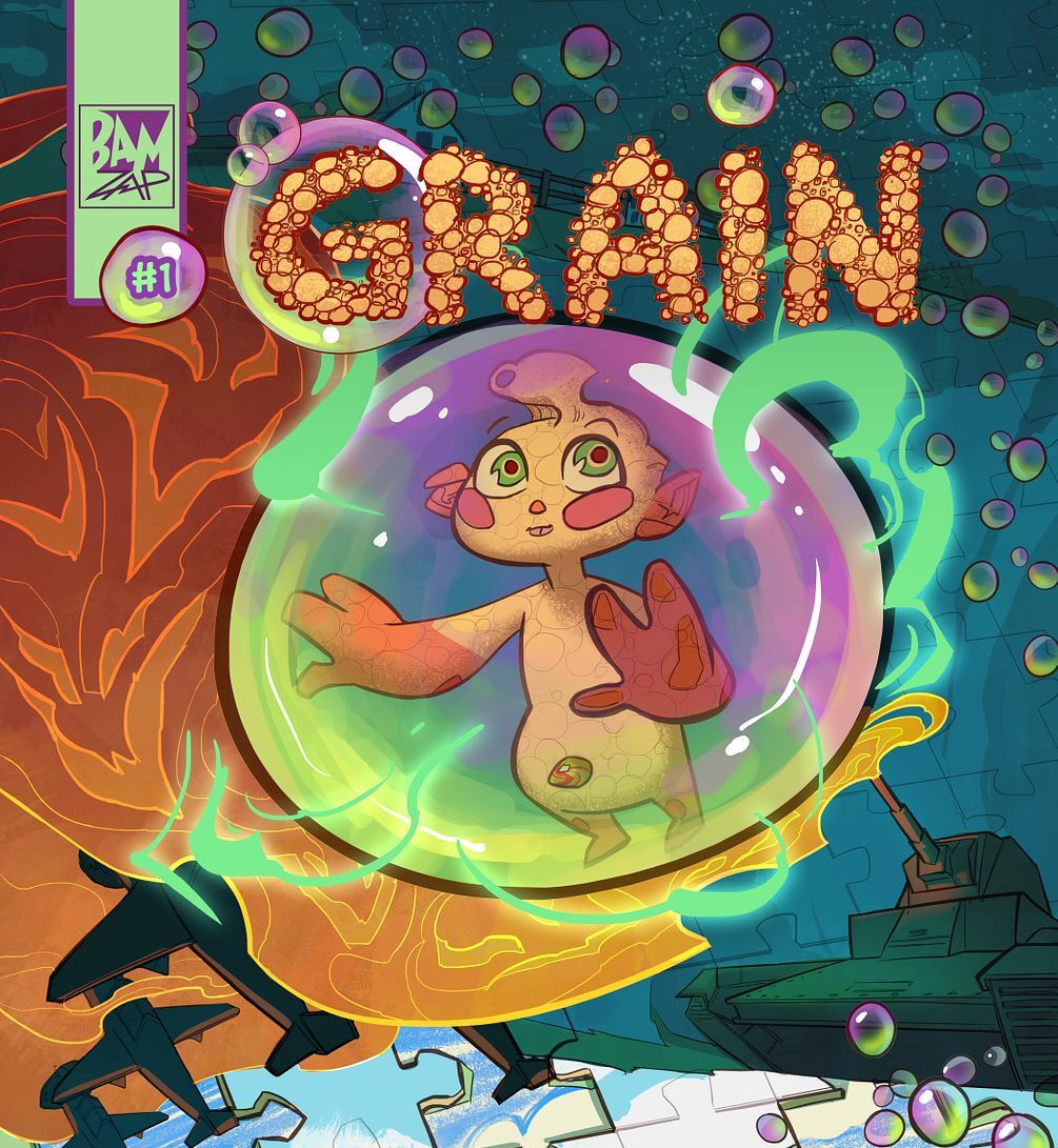 Grain Issue #1 is 28 pages in full color and meant for all ages. Grain can be read to younger children as well. Art & Lettering by Roma Gewska. Created and Written by Mark Verma.